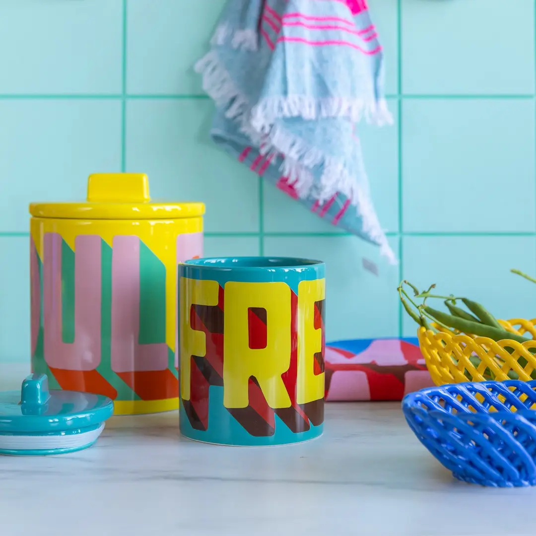Een andere geweldige manier om kleurrijke keukendecoratie-ideeën te omarmen, is door levendige details toe te voegen. Keramische accessoires zoals de nieuwe keramische manden en kleurrijke opbergpotten van Kitsch Kitchen voegen moeiteloos opvallende kleuraccenten toe aan uw planken of aanrecht. Meng tinten zoals felgeel, blauw en oranje voor een eclectische, levendige look.