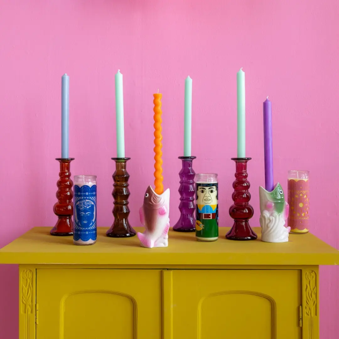 Verlichting speelt een belangrijke rol in kleurrijke keukendecoratie-ideeën, en voegt warmte en sfeer toe. Kies voor speciale verlichting accessoires zoals de kleurrijke Candle Holders & Jars — van Kitsch Kitchen. Zet verschillende kandelaren bij elkaar op een decoratief dienblad om een charmant middelpunt te creëren. Als u jonge kinderen hebt, overweeg dan elektrische kaarsen voor een veilig maar gezellig effect.