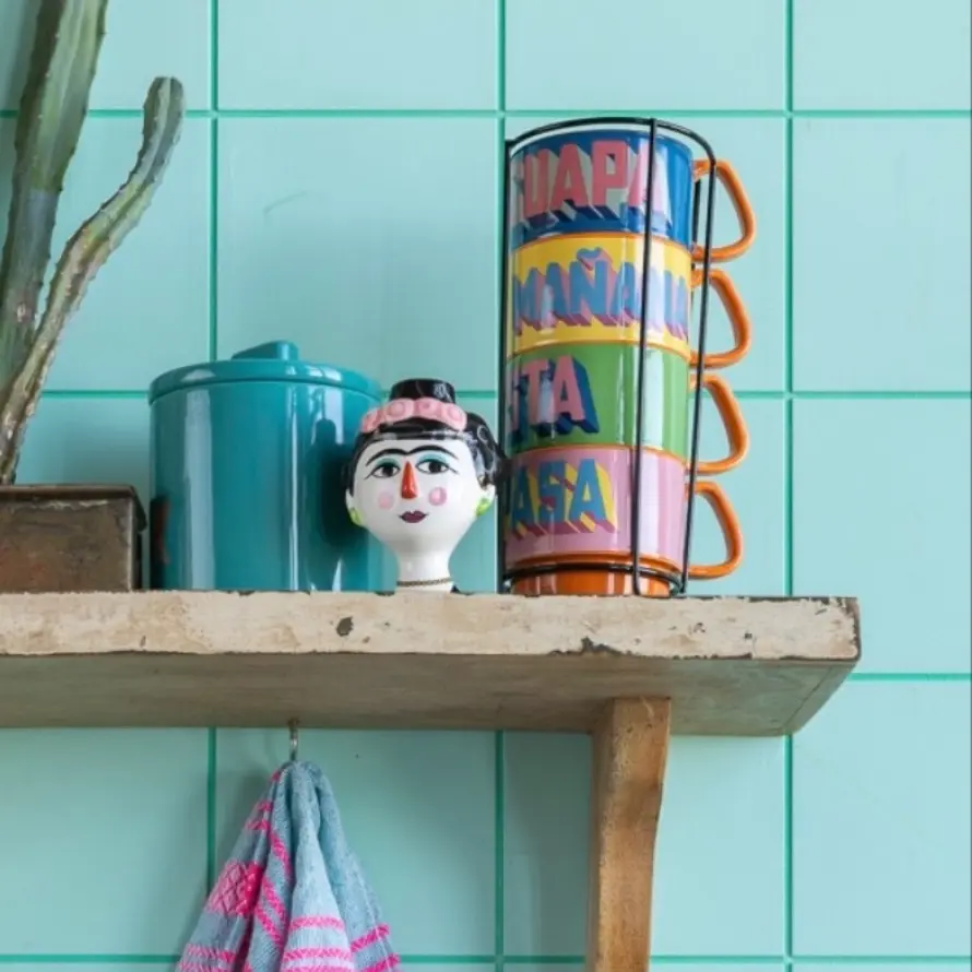 Open planken bieden een uitstekende mogelijkheid voor kleurrijke accessoires voor keukeninrichting. Zet je favoriete servies zoals Kitsch Kitchen’s Sea Life Plates en de speelse nieuwe set van 4 kopjes in de spotlight. Door deze kleurrijke items prominent tentoon te stellen, worden ze aantrekkelijke blikvangers op uw muren of keukenplanken.